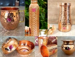 Copper utensils like Bottles, Class, pots, wok, and god Idol Statue